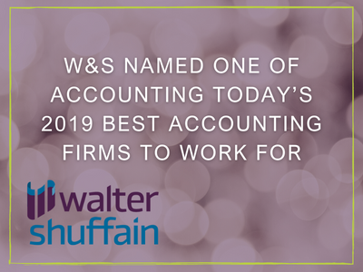 Walter & Shuffain, PC, was recently named as one of the 2019 Accounting Today’s Best Accounting Firms to Work for. Accounting Today has partnered with Best Companies Group to identify companies that have excelled in creating quality workplaces for employees.…