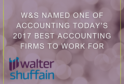 Walter & Shuffain, P.C. was recently named one of Accounting Today’s 2017 Best Accounting Firms To Work For. Accounting Today partnered with Best Companies Group to identify the top 100 companies that excel in creating quality workplaces for employees. The…